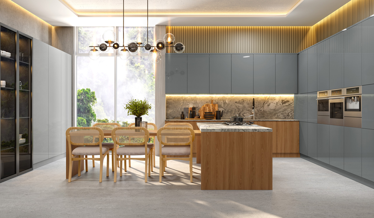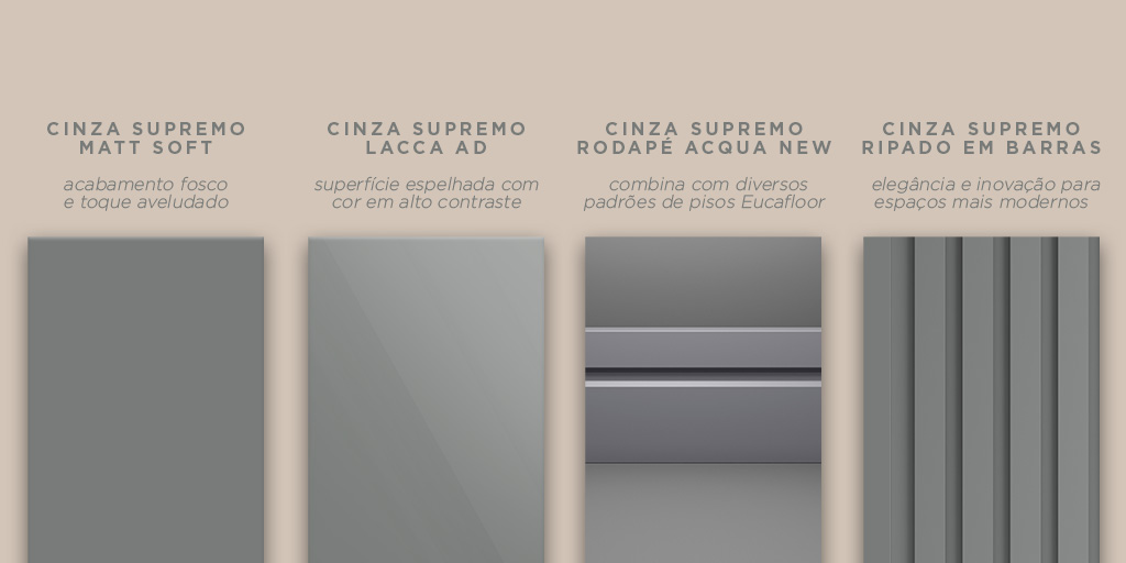 Inicialmente, o padrão Cinza Supremo chegou no acabamento BP Matt Soft em padrões MDF, com acabamento fosco e toque aveludado, a superfície lisa e opaca traz um visual arrojado e sóbrio.